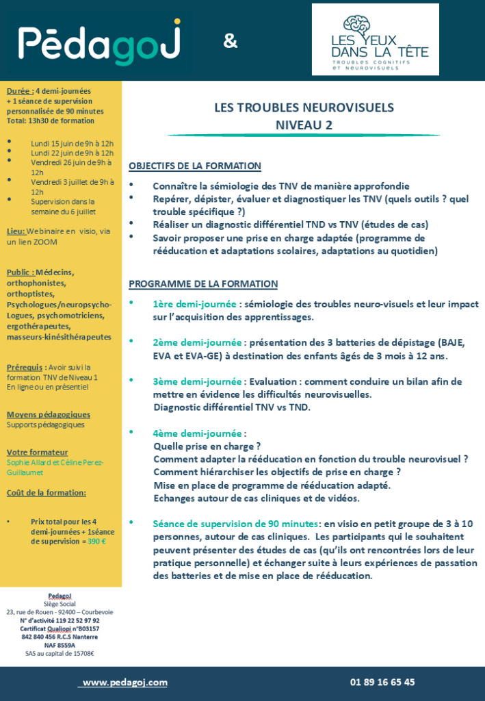 Cette formation de niveau 2 est ouverte aux professionnels ayant déjà participé à une formation de niveau 1 sur les troubles neurovisuels (TNV) chez l’enfant avec l’association les Yeux dans la tête, sur la plateforme PedagoJ ou à une formation avec Sylvie Chokron, Céline Perez Guillaumet ou Sophie Allard.